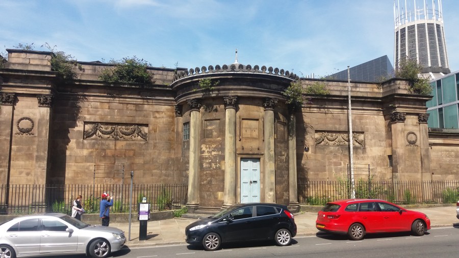 A building that always catches your eye on Mount Pleasant is the Wellington Rooms. For years it was the Irish Centre but it was originally built by public subscription in 1815-1816 as a ballroom and a centre for the fashionable of Liverpool society to gather in. It kept this function until 1923 when it was converted into a private club called the Embassy Rooms. One can’t help imagining (or at least I can’t and I admit there is no evidence to support this notion) that this must have been a rather louche period in the building’s history. Later years saw it used as a youth club and in 1965 it became the Irish Centre which it remained until 1997. Since then the building has been abandoned and the impressive neo-classical structure designed by Edmund Aikin has become a derelict home for buddleia. I stopped as I walked by because the open letterbox gave me the chance to take a picture of the interior. There you can still see a faded and torn notice directing members to what I guess were the J.F. Kennedy Bar, the Ballroom and the Claddagh Room. Others also took the opportunity to scrutinise the view through the letterbox and it seems such a shame that a building of such style should be so neglected. According to the Liverpool Echo (9 July 2017) the Duchy of Lancaster now has a lease on the building and many online sources suggest there are plans to bring the building back into use as a Science and Technology Hub.