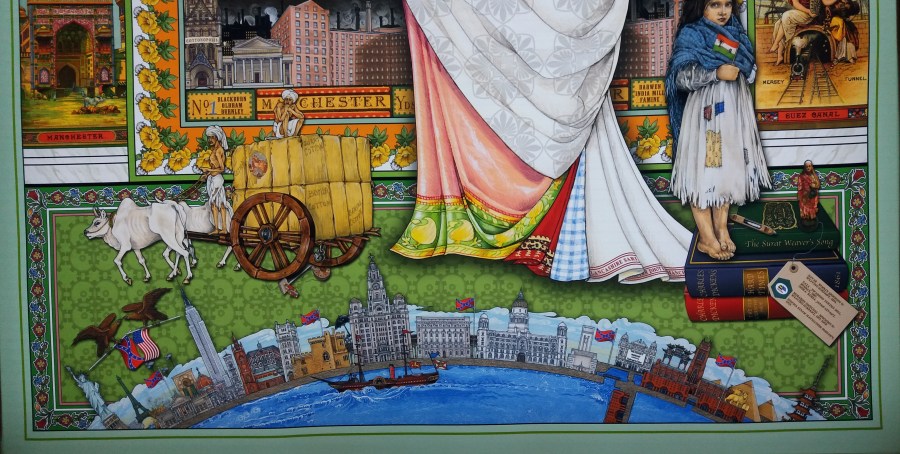 They have such an eye for detail and incorporate in each of the eleven major works vignettes from the history of the interaction between luxury consumption, trade, and imperialism. It asks so many questions about ethical trade and the history of consumerism and Liverpool is such an appropriate place for this appear. The image at the top of this page is a detail taken from their work ‘Cotton: Threads of Change’, a raw material produced originally in India and central to the economic development of Liverpool as a port as part of the ‘Atlantic Trade’.