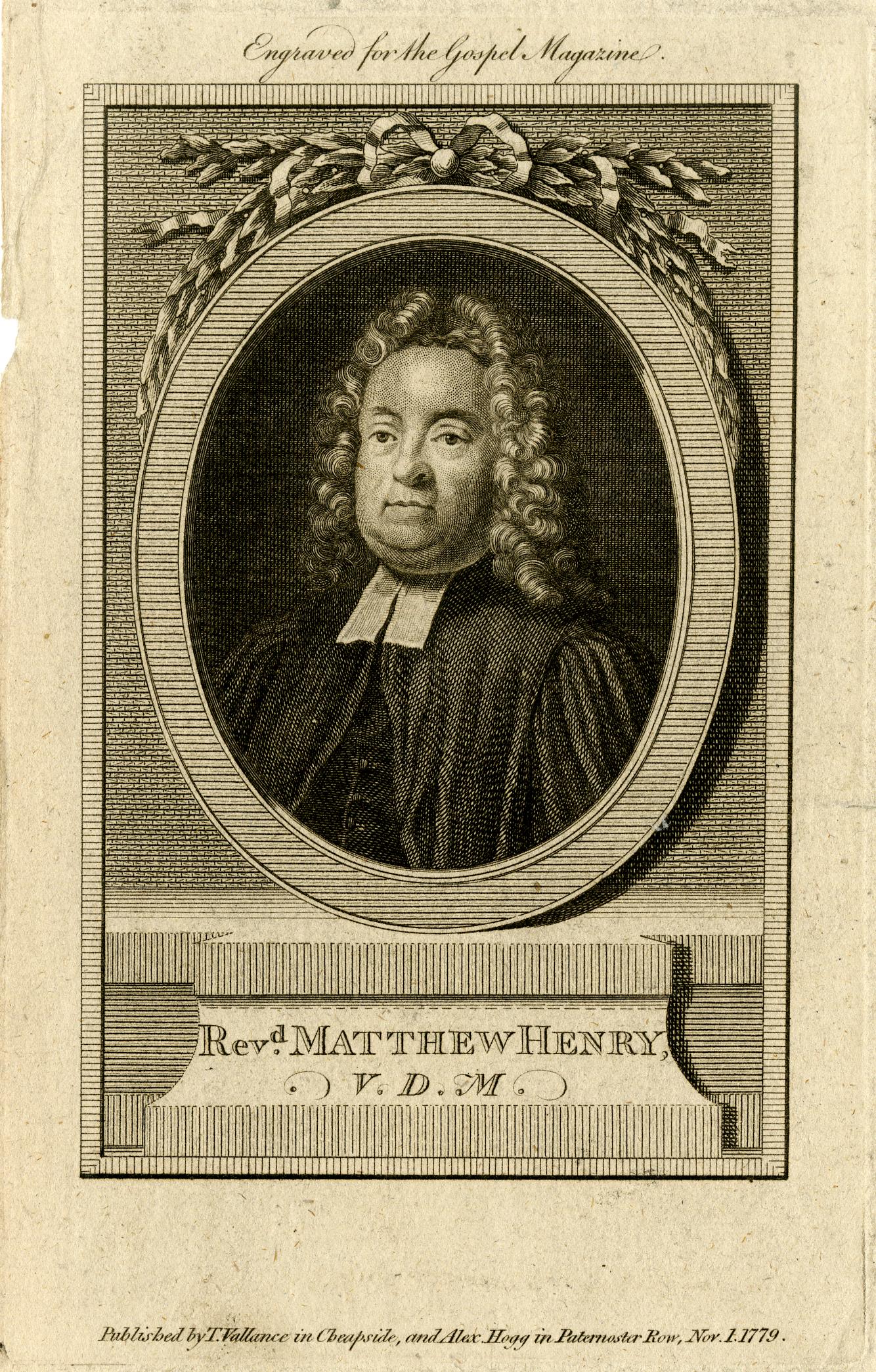 Portrait of Matthew Henry, half-length, in an oval surmounted by ribbons and laurels, slightly turned to the left, dressed in an academic gown with bands at his neck and a periwig on his head, illustration to the “Gospel Magazine” (1779) Engraving and etching