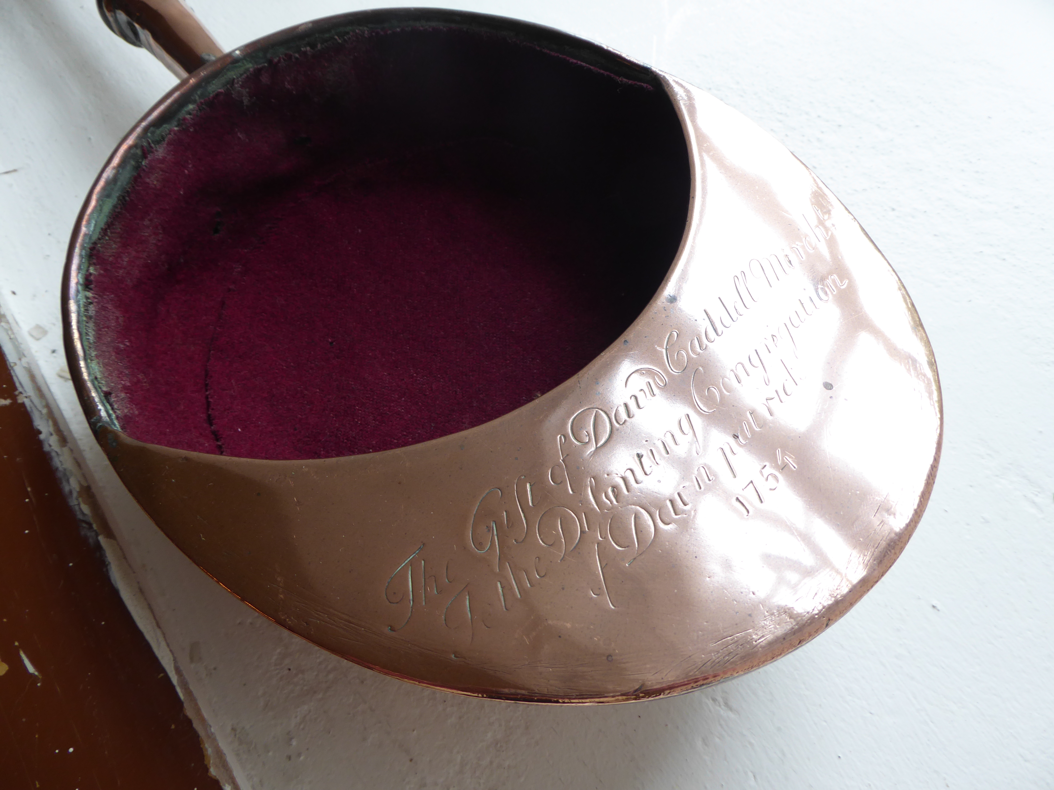 At first sight it might seem strange to select Collecting Ladles as the subject for letter ‘C’ in our alphabetical exploration of the Non-Subscribing Presbyterian Church. But Collecting Ladles formed a fairly essential part of church life for Presbyterians in Ireland and Scotland for generations. In some places they are still in use today but often aren’t recognized by those outside the Scots-Irish Presbyterian community. The above picture perfectly illustrates their use in a church in Scotland. It is a delightful image, although the people in the pew being asked for their offering seem to display something of the modern concept of the ‘messy church’ more than anything else. But collecting ladles also lead us into questions of giving and the stewardship of resources.