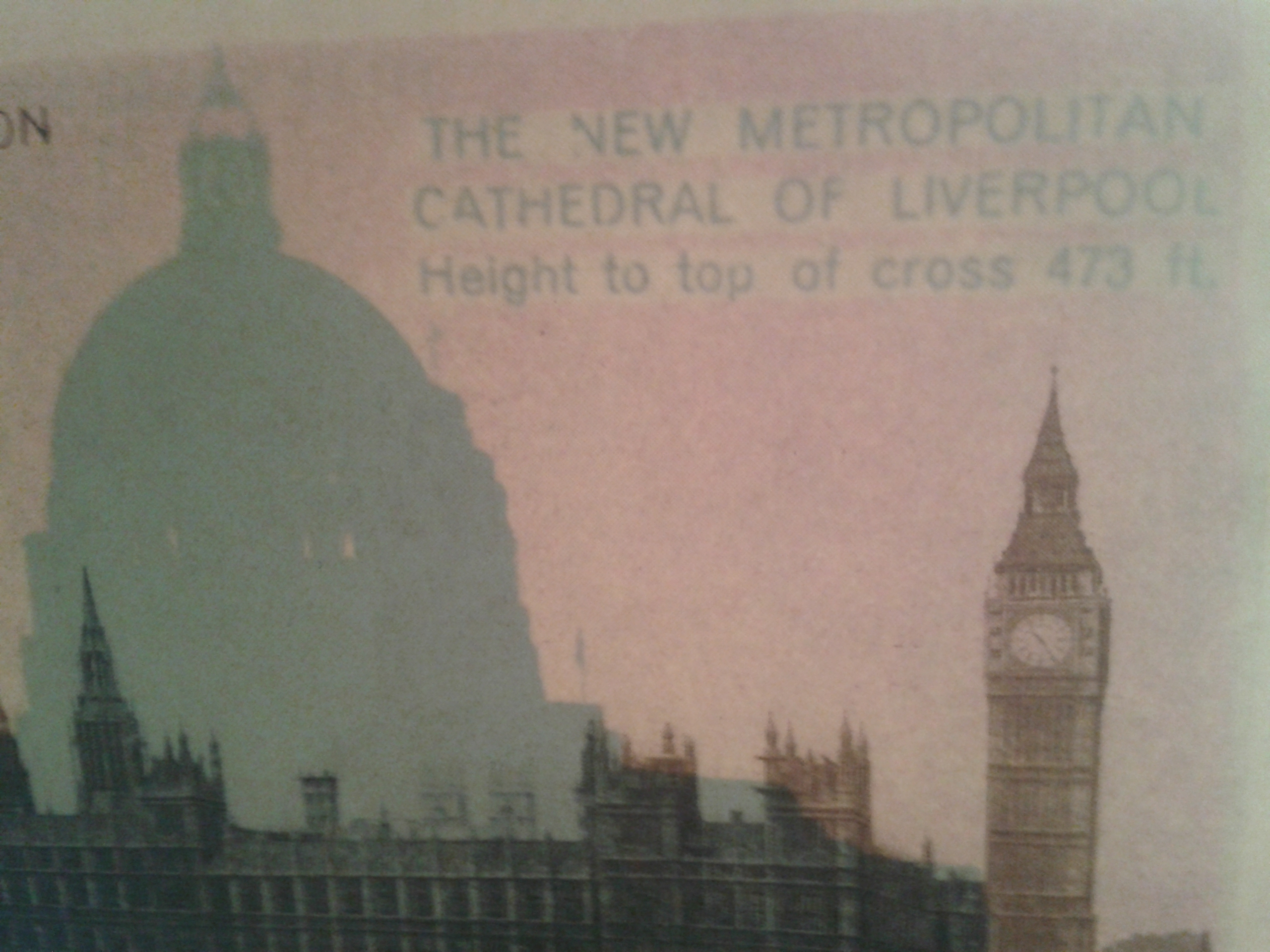 The original plan had been very extravagant indeed, a massive structure that would have dwarfed the large Anglican Cathedral nearby. Sir Edwin Lutyens was brought in to provide a plan for the second biggest cathedral in the world, the model for which can still be seen in the Museum of Liverpool. I have a promotional postcard from the 1930s that shows just how big they expected it to be: