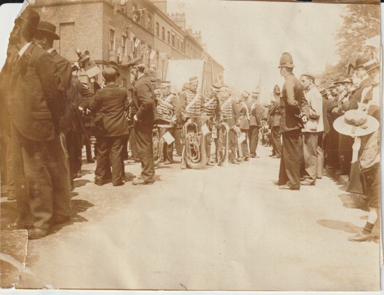 It could well be part of the Liverpool parade to mark the coronation and that seems likely since it came with another picture of that day. However, there are other alternatives. Patriotic and religious parades were a big deal in Liverpool at the time. This one does not look like it might have been ‘contentious’, as we would say today. So it could be linked to some church event. Unfortunately the details on the banner are not remotely legible but I would guess it is a church related banner rather than an Orange one (there are no signs of any sashes or collarettes in the parade so it is not an Orange parade).