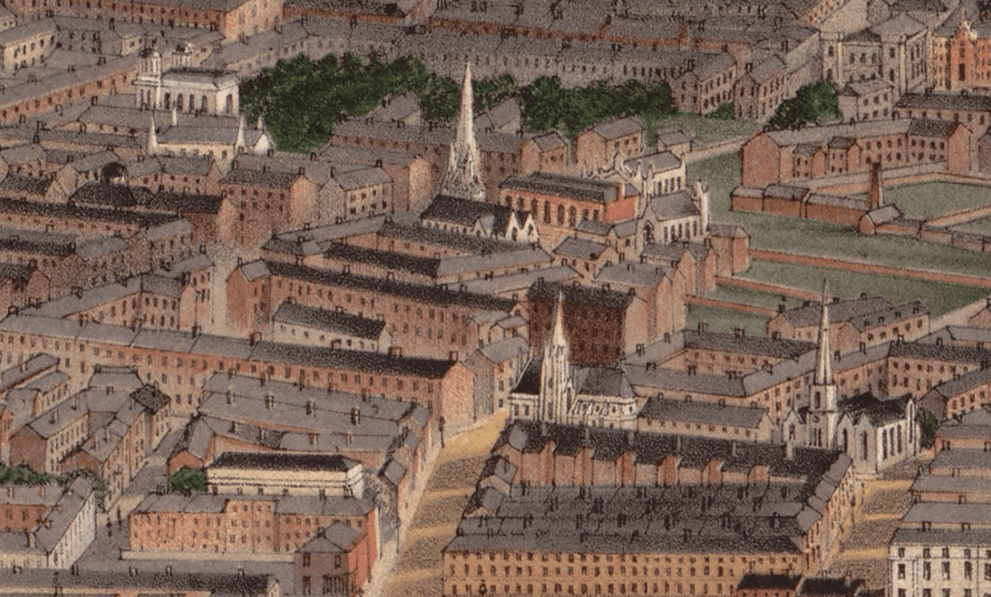 The image at the top of the page is a detail from an aerial view of Liverpool by John R. Isaac in 1859 and published in New York. This is a view from a hot air balloon and can be viewed on the Library of Congress site here.