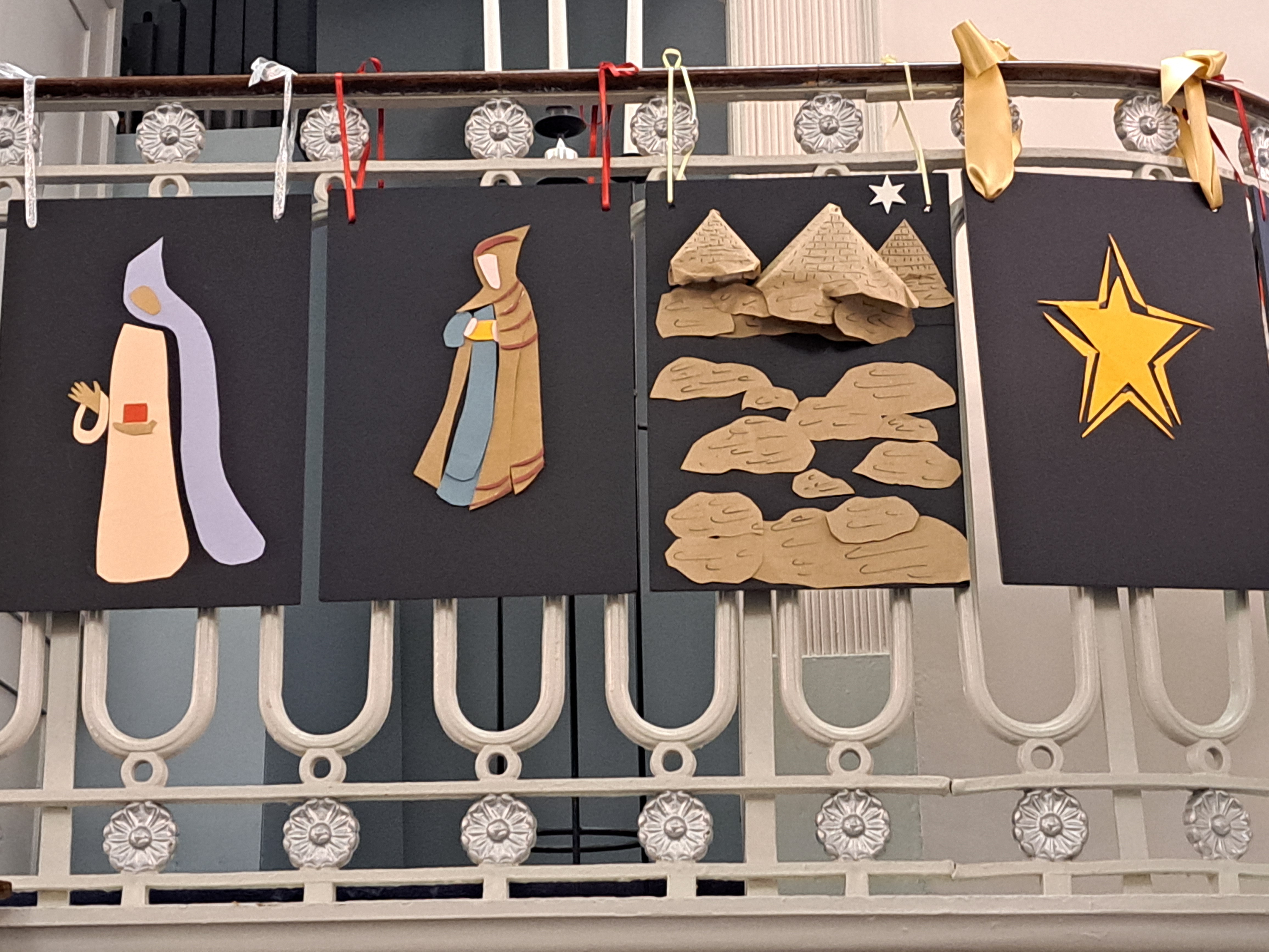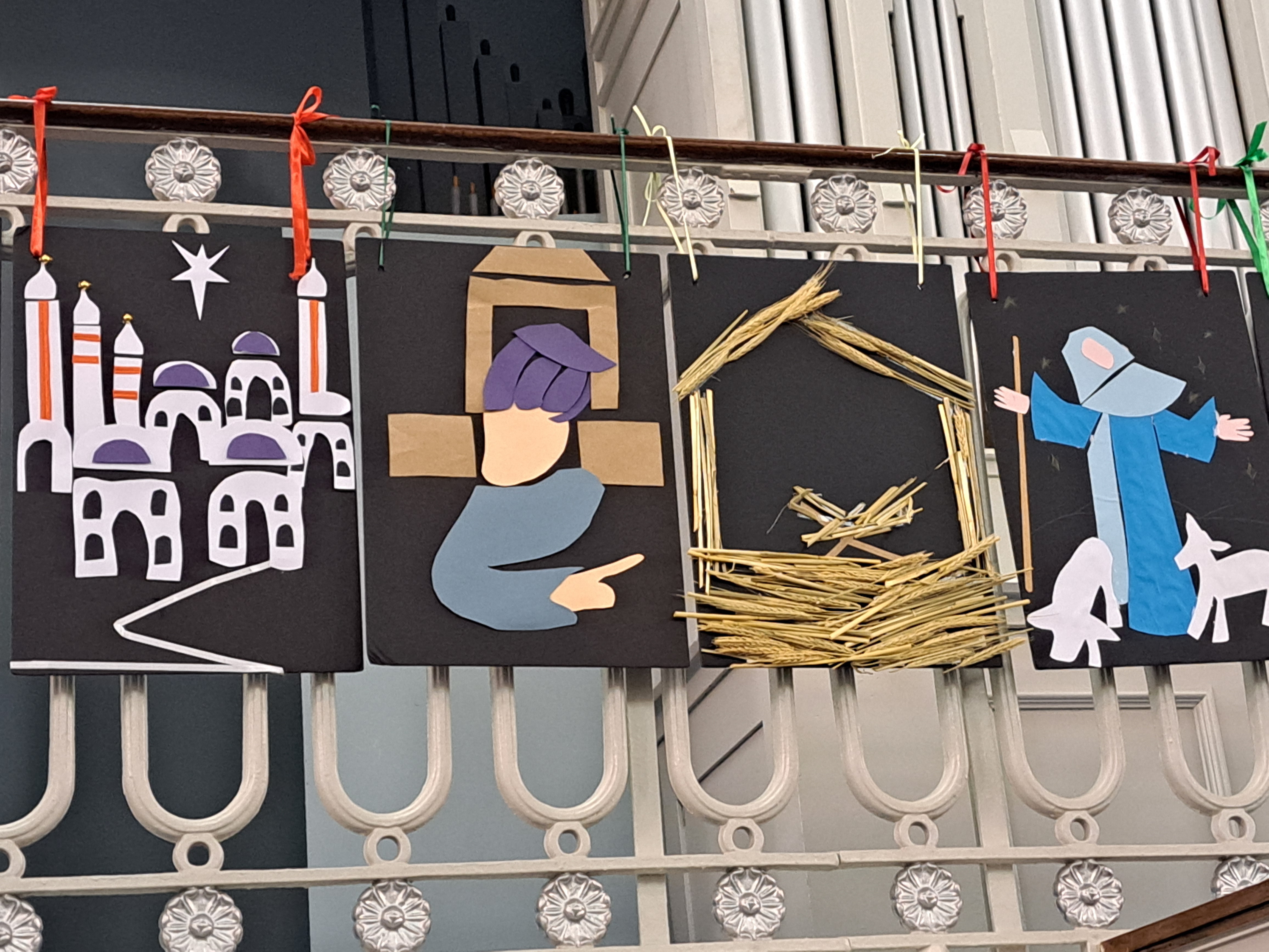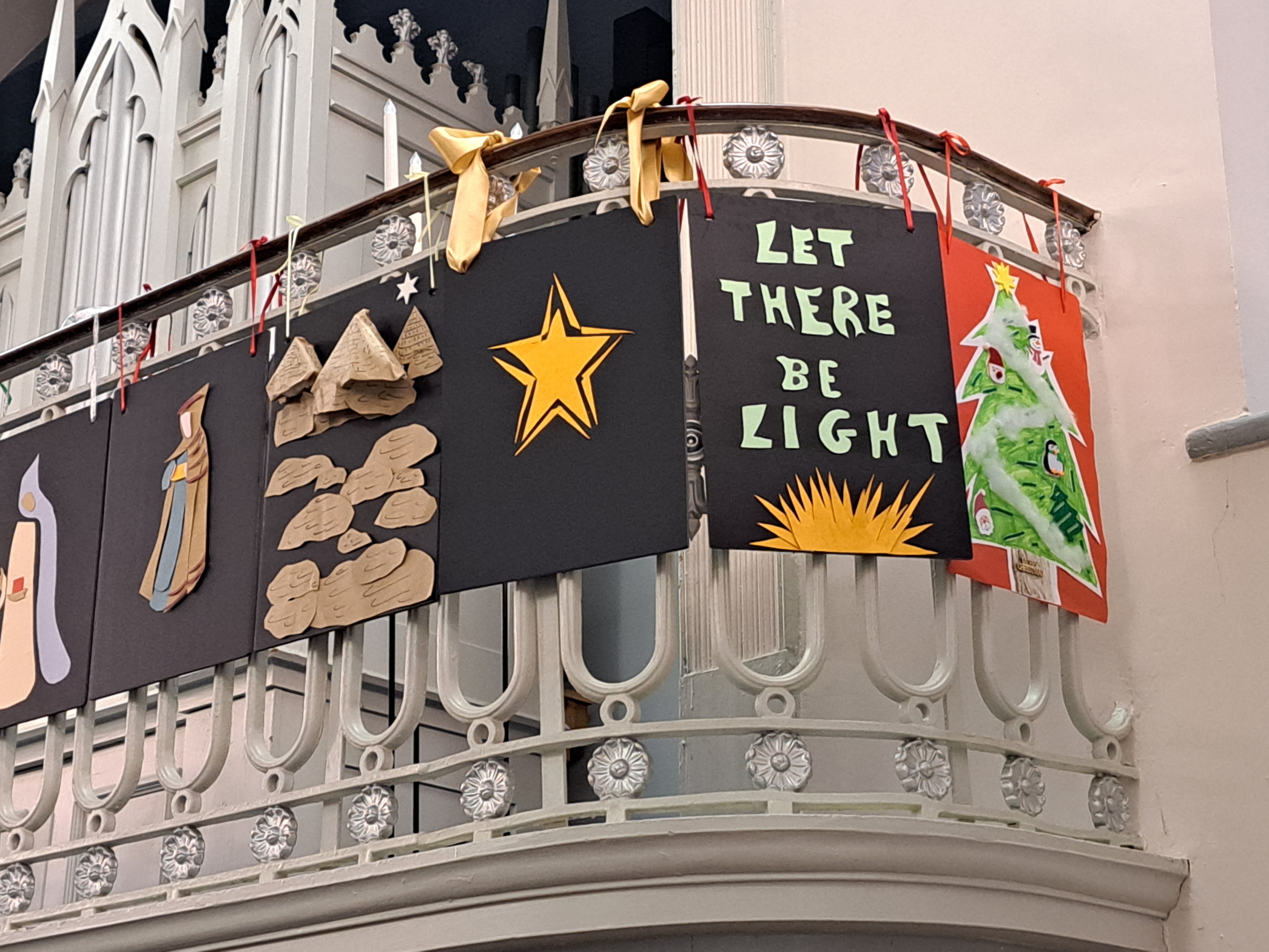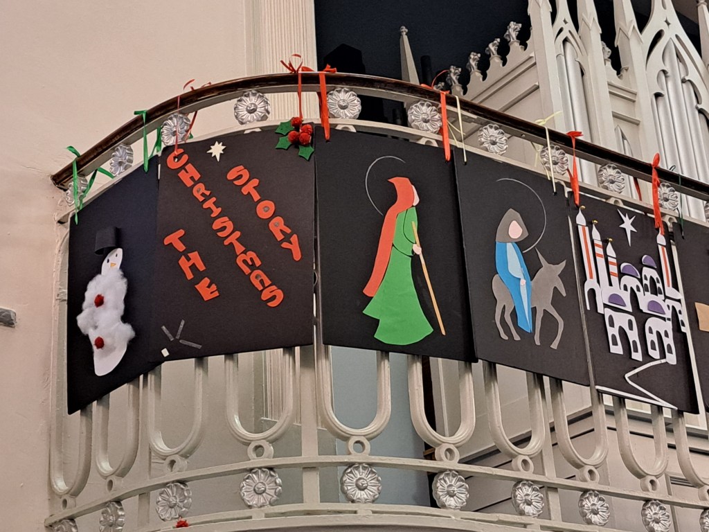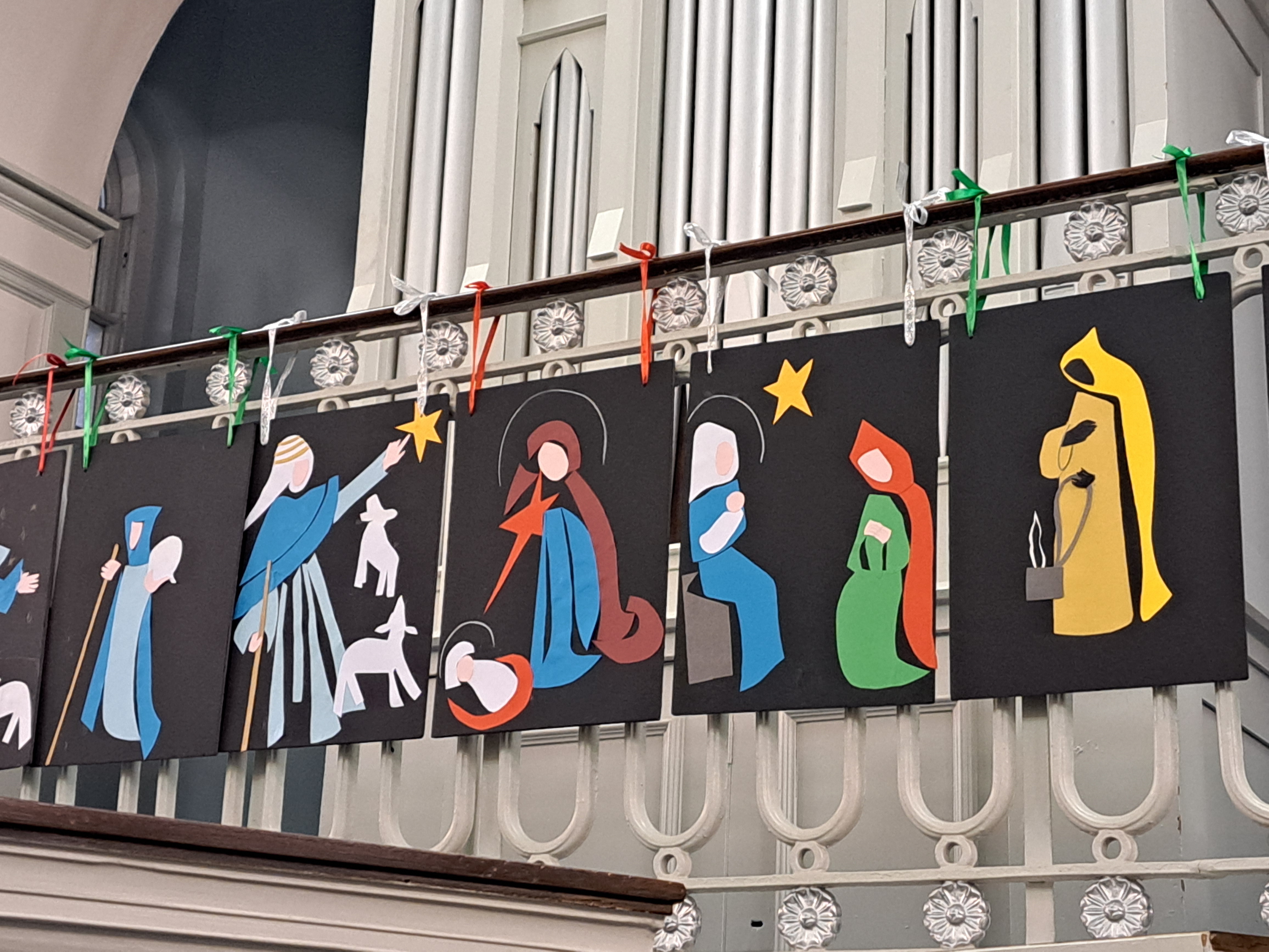 The video also includes some of the Christmas decoration in the Church including the excellent frieze created by the children of the Youth Group along the rail behind the pulpit, which can be seen in more detail below: