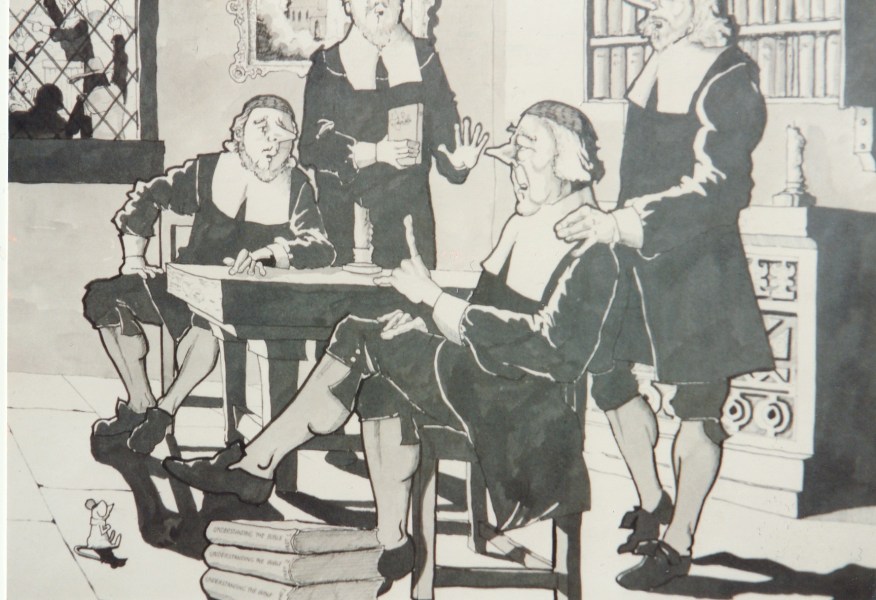 ‘There are two extreme forms of the expression of religious sentiment. There is one that is very well expressed in the person here described: “His mind and voice had precisely the fluid quality of some clear, subtle liquid: one felt it could flow around anything and overcome nothing.” That is the extreme of presenting the Christian faith in such delightfully attractive style, with such a fluency of language, with such a vividness of imagery, that it will flow around anything and overcome nothing. At the other extreme there is another sort of Christianity, corybantic Christianity. There is a cartoon on the wall there, a drawing of four rather austere clerics, and the date is 1626. Outside you see somebody rousing a rabble – not unheard of in these days. The four rather serious looking clerics are trying to bring a bit of reason into it all; and the man outside is an exponent of corybantic Christianity, the Christianity that is the direct oppposite of that I have been describing tonight – and appeals all the time to the emotions in which people get carried away, and leads in the end to a very dangerous, in fact terrible, fanaticism – the very negation of the Christian spirit.’