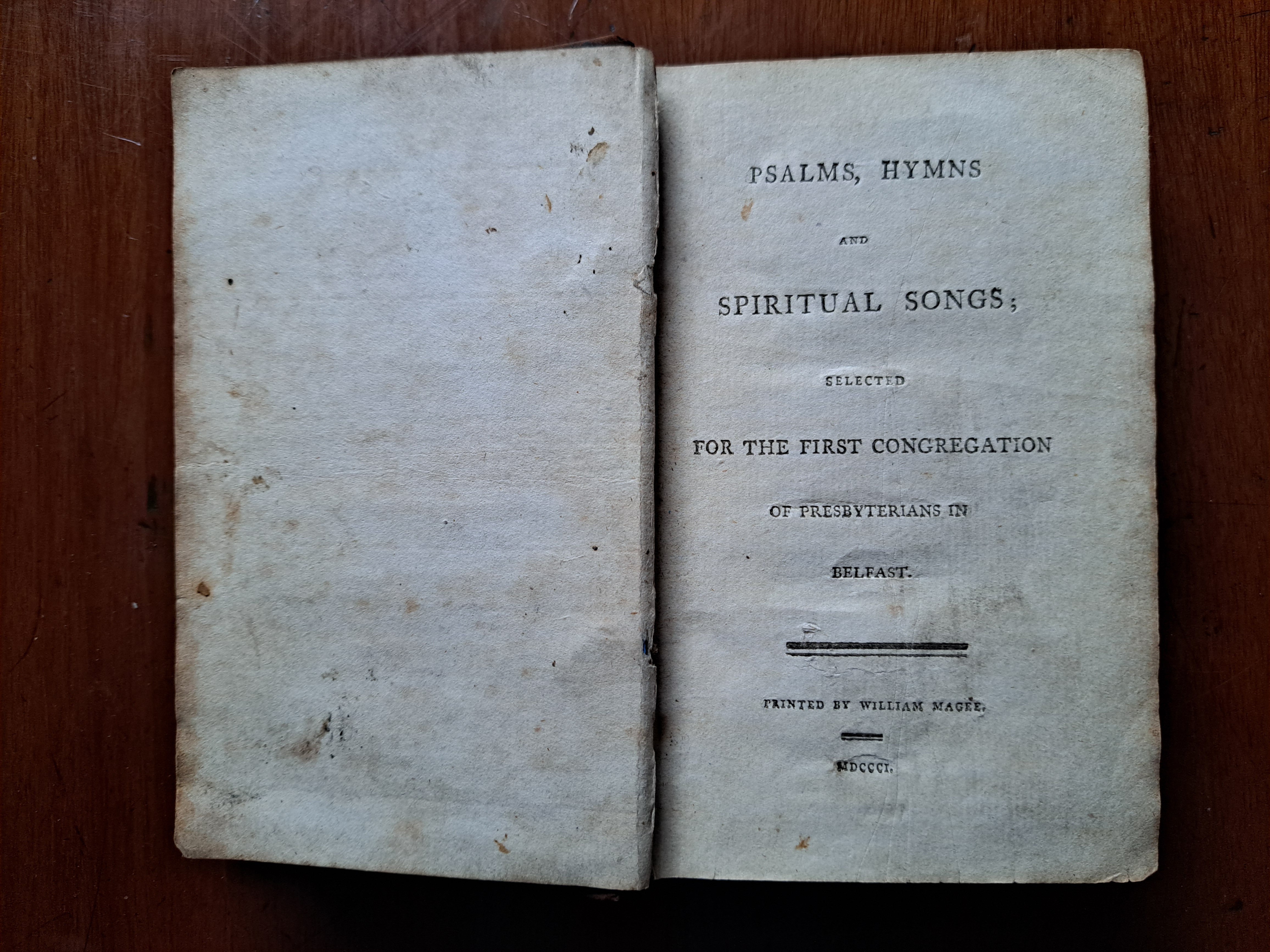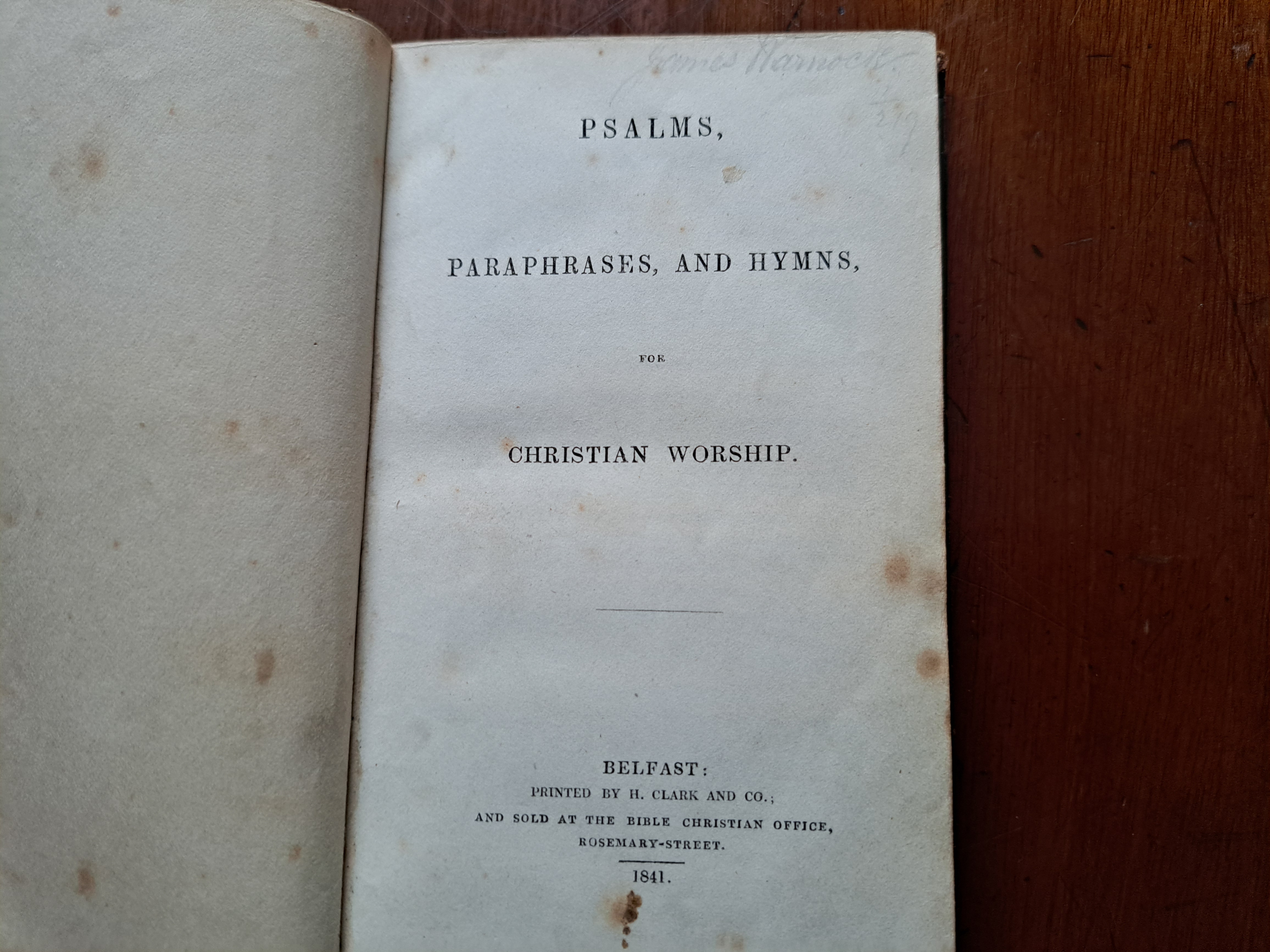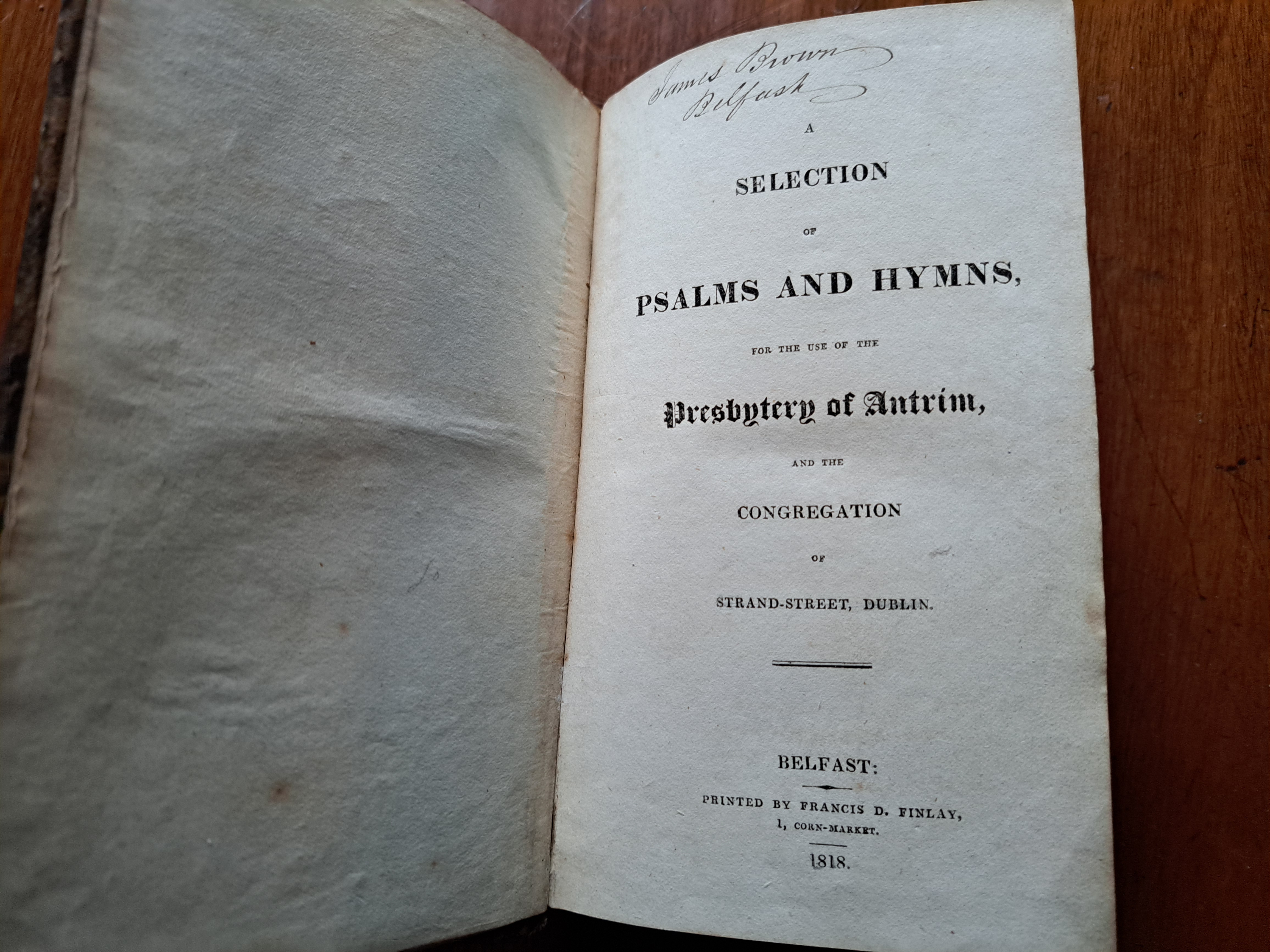Following the establishment of the Remonstrant Synod of Ulster in 1830 Non-Subscribers moved towards the development of a hymnbook for all churches. This is Psalms, Paraphrases, and Hymns, for Christian Worship published in Belfast in 1841: