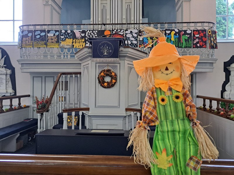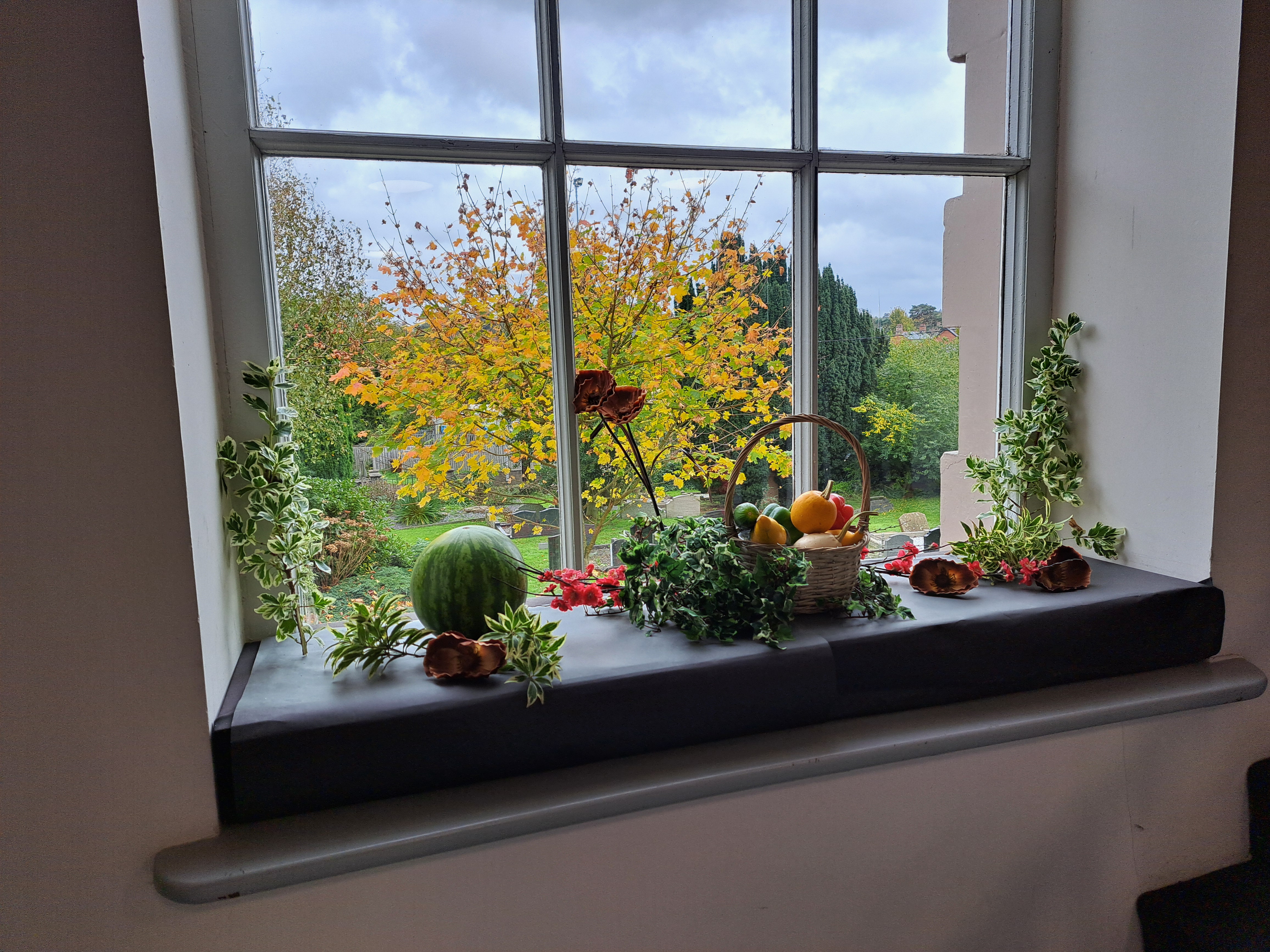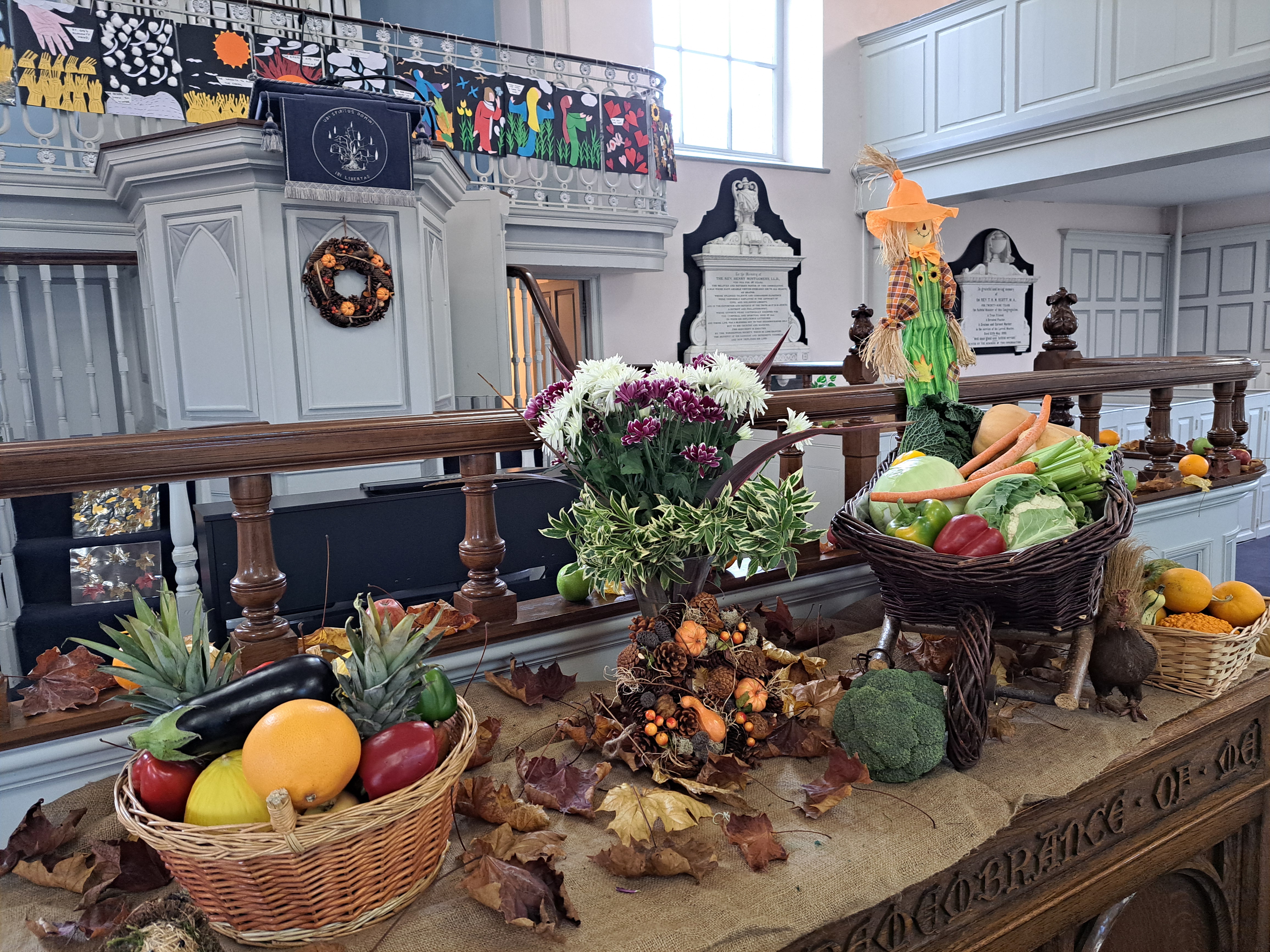 The service was led by members of the Sunday School and Youth Group with Harry opening the service with words of welcome, readings being given by Jenna, Lochlan, Erin, and Bryn, and Adele and Sue, leading us in prayer. The church was beautifully decorated throughout and the Youth Group made the frieze depicting scenes from the hymn We plough the fields and scatter (which we also sang) which adorned the rail above the pulpit.