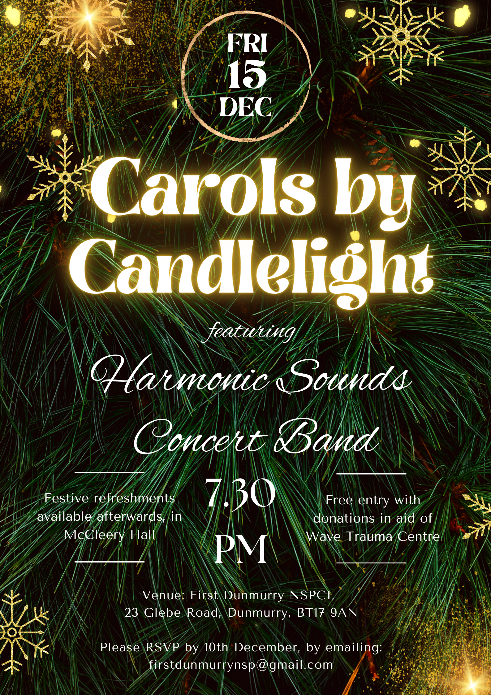 At Dunmurry we are really looking forward to our Carols by Candlelight service on Friday, 15th December at 7.30 pm when we will welcome Harmonic Sounds Concert Band with their Director of Music, Paul Hamilton. We will tell the story of Christmas through traditional carols and the traditional Christmas readings given by church members and friends from other churches. Everyone is welcome.