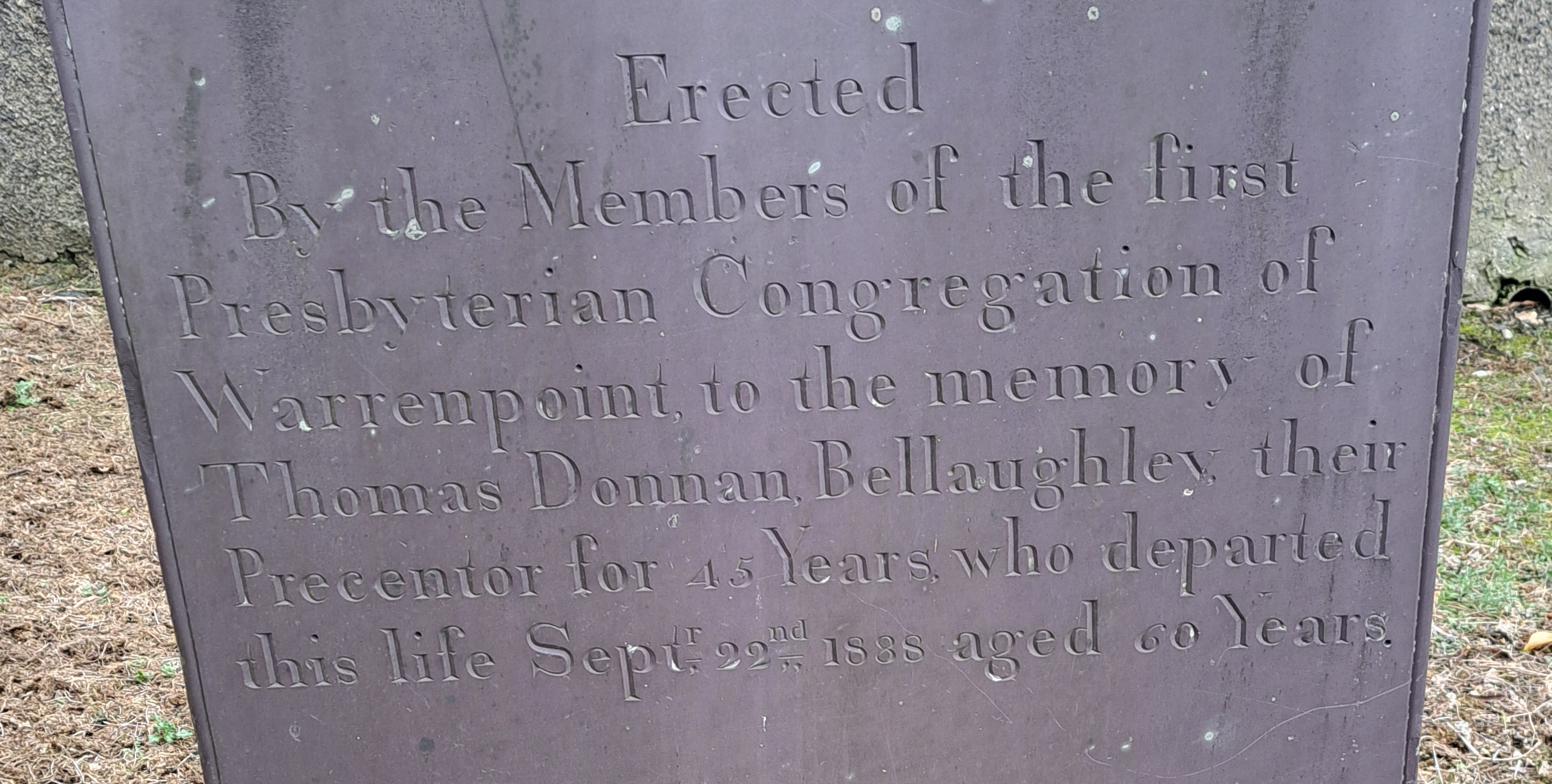 Thomas Donnan, of Bellaughley, was the Precentor of the Warrenpoint Non-Subscribing Presbyterian congregation for 45 years up to his death in 1888. He was 60 when he died so he must have been just 15 when he commenced this work in 1843.
