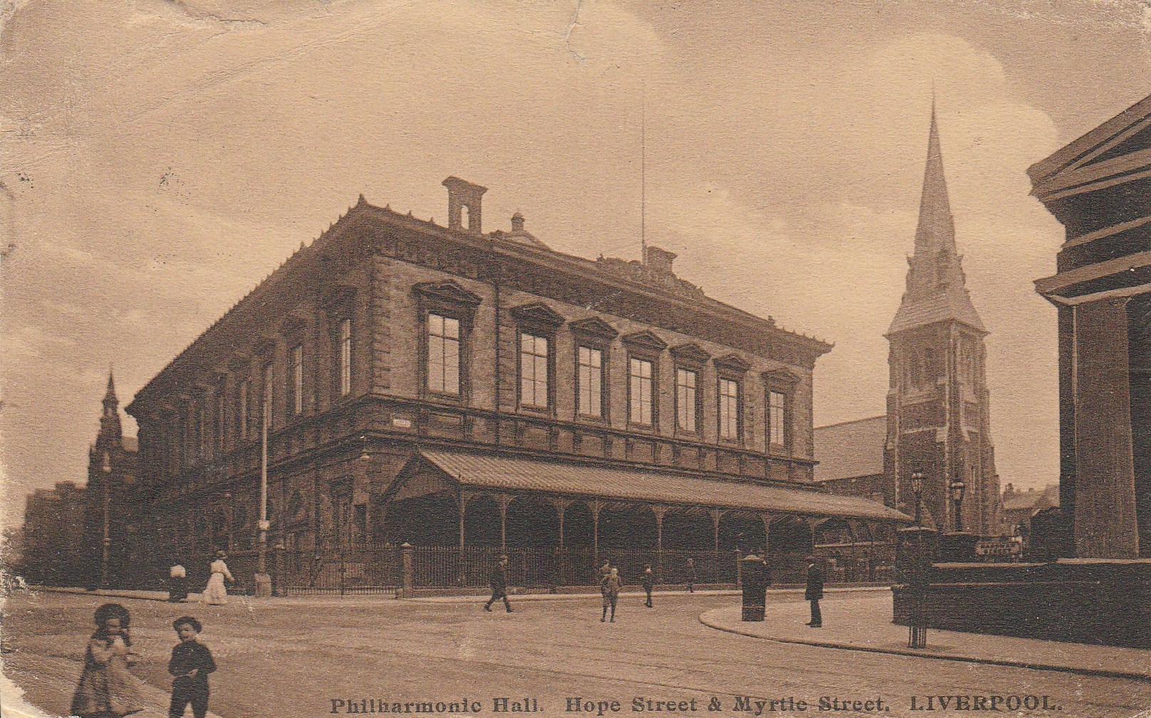 Its relationship to the next-door Philharmonic Hall can be seen from this Edwardian postcard. The original Philharmonic burnt down in the 1930s and was replaced by the present building in 1939. In the picture the classical church opposite, the corner of which can just be seen on the right of the postcard, was the Church for the Blind, attached to the Liverpool School for the Blind which was situated on Hardman Street.
